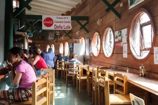 Las cocinerías están en un mercado que tiene forma de barco y que también está construido como un palafito, lo que da la impresión de que el edificio flotara en el canal. Una vez adentro, las ventanas y las más de veinte cocinerías siguen la estética de un barco, por lo que durante un almuerzo, uno de verdad siente como si estuviera en uno.